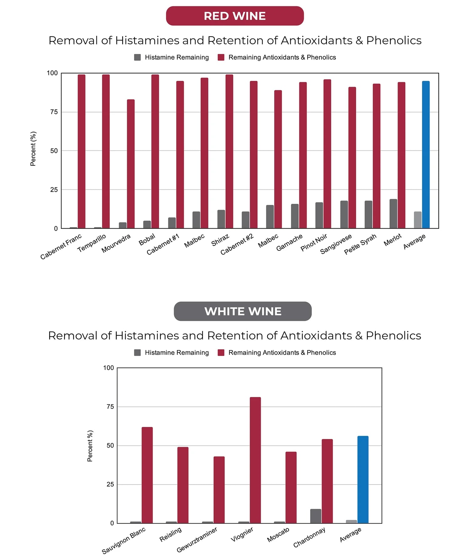 The PureWine® filtration technologies have been thoroughly tested by a leading independent laboratory to confirm that the histamines and sulfites are being effectively removed from a wide range of wines produced in the leading wine growing regions throughout the world, see the Infographics above.